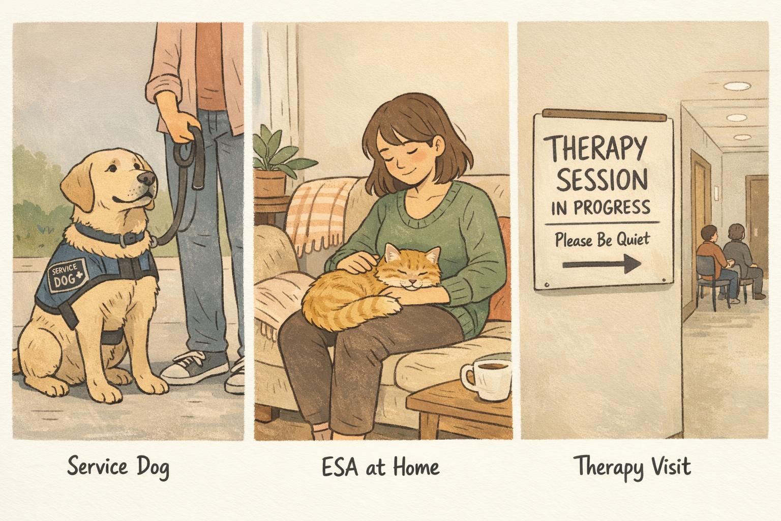 A service dog is trained to perform specific tasks that help a person with a disability. An emotional support dog (ESA) provides comfort through companionship and presence, often in a home environment. A therapy dog is usually part of a volunteer team that visits facilities to support groups of people.